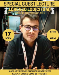 Fee: 4,000 yen. Includes free entry to the evening chess club session from 6 PM onward. (Please order a drink if you stay to play.)